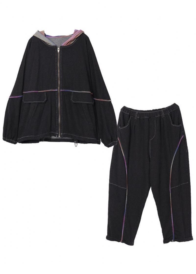Vackra Svarta Lösa Casual Hooded Dragkedjor Fall Tvådelad Set LångärmadTyg: Bomull Blended