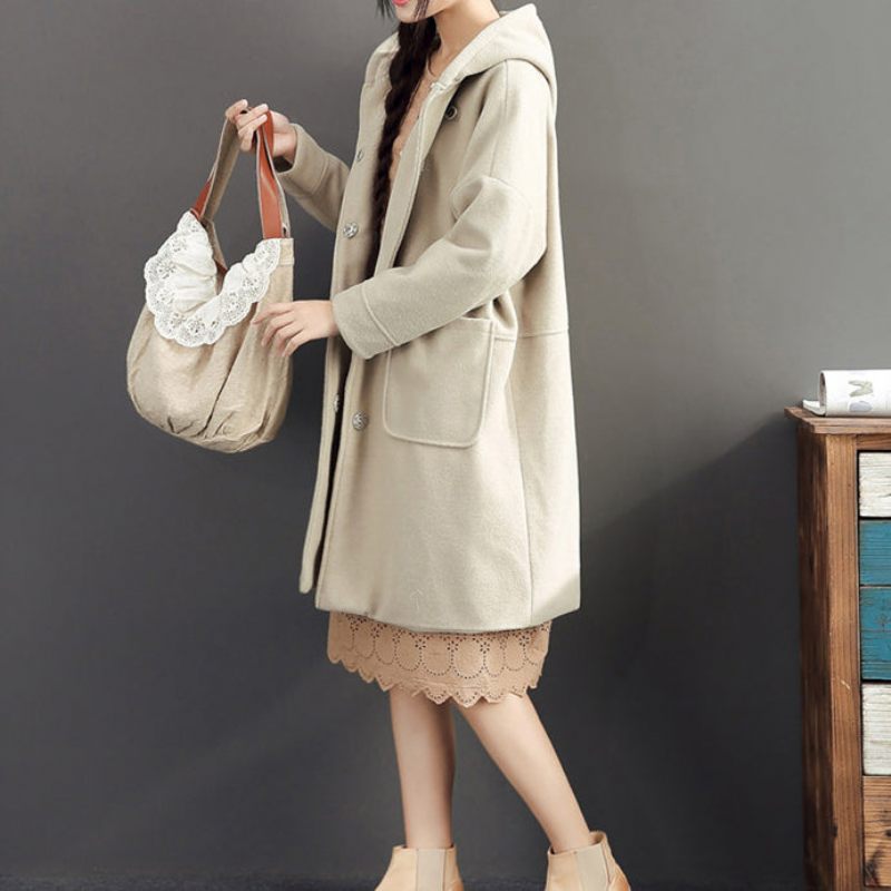 2024 Vinter Ljusgula Yllerockar Plus Size Huva Elegant Trenchcoat