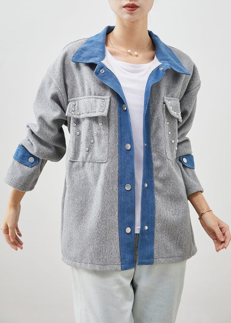 Art Grey Oversized Patchwork Rivet Woolen Jacka Spring