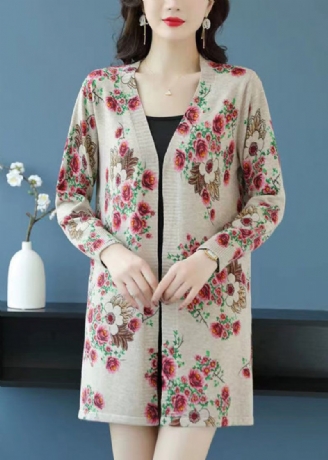 Art Khaki O-neck Oversized Print Knit Coats Winter