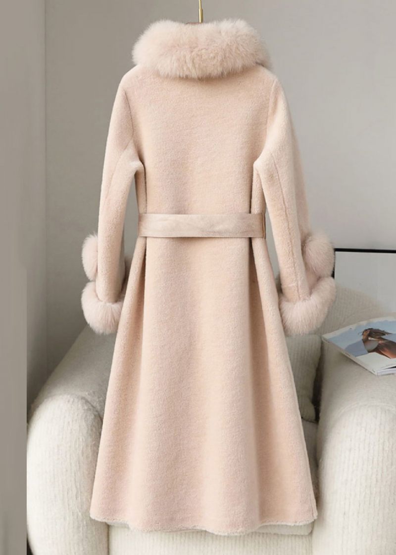 Beige Fickor Patchwork Fuzzy Fur Lång Kappa Pälskrage Långärmad