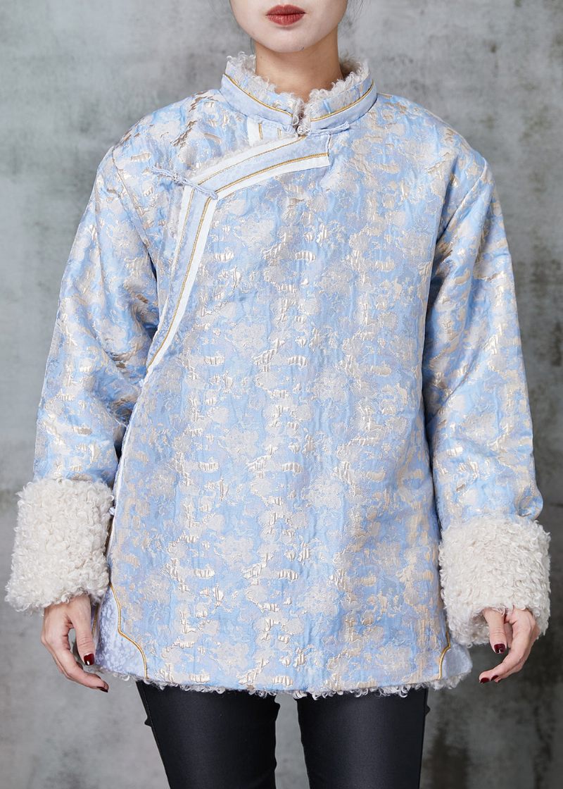 Blå Jacquardfleece Ullfodrad Kappa Ytterkläder Kinesisk Knappfjäder