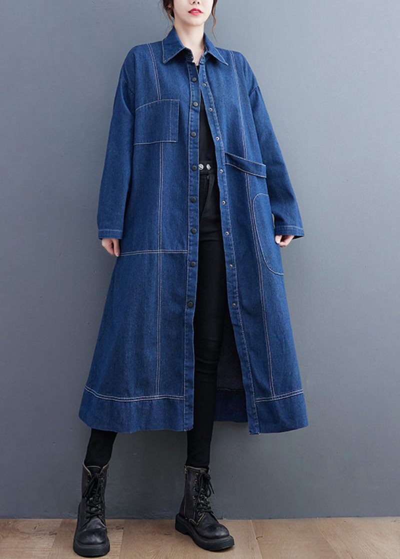Blå Patchwork Denim Lång Trench Coat Peter Pan Krage Långärmad