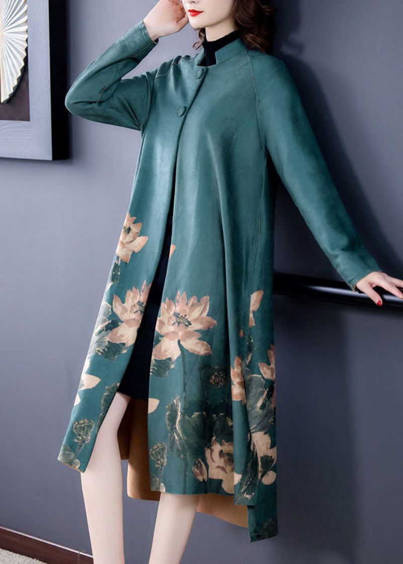 Blått Tryck Fint Fuskmocka Lös Trench Stand Krage Knapp Långärmad