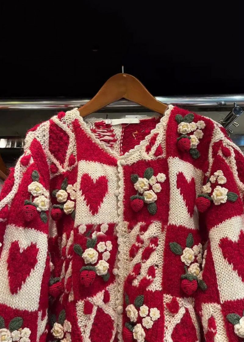 Blommig Röd O-ringad Knapp Patchwork Stickad Cardigan Långärmad