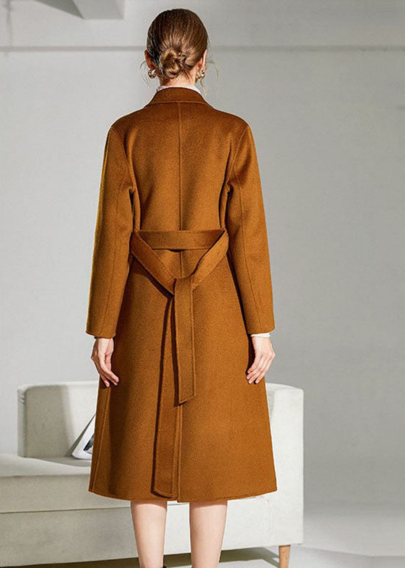 Boho Caramel Peter Pan Krage Sashes Woolen Double Breasted Coat Winter