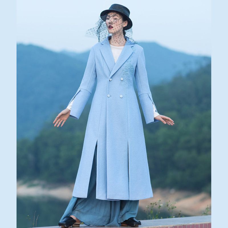 Boutique Ljusblå Yllerock Dam Löst Sittande Lång Kappa Öppen Långärmad Broderirockar