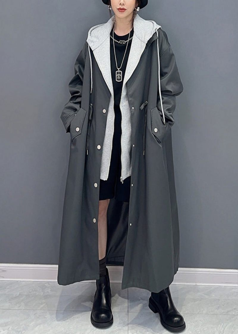 Boutique Svarta Fickor Hooded False Two Pieces Patchwork Trench Coat Fall