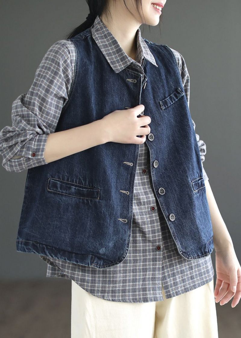Brief Denin Blue Pockets Patchwork Denimväst Ärmlös