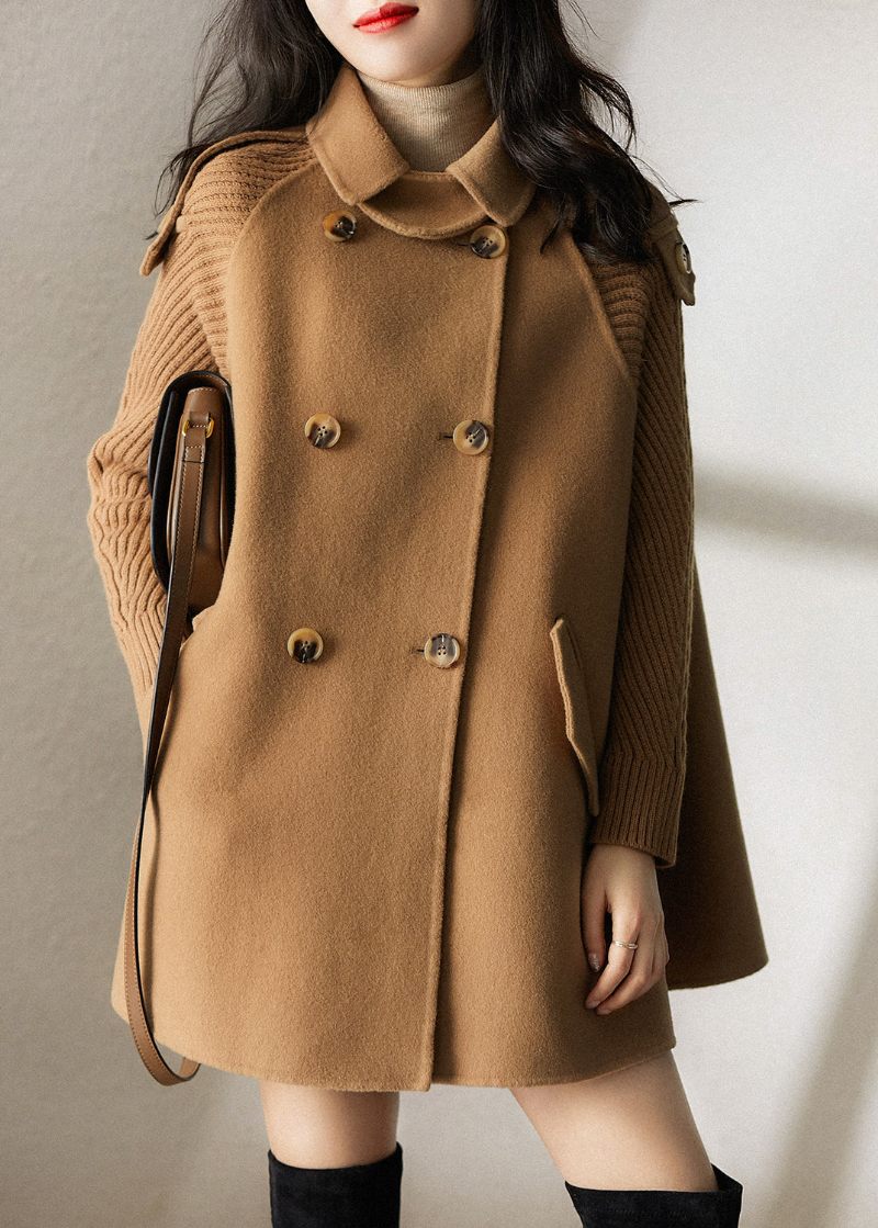 Camel Knitted Patchwork Woolen Coat Dubbelbröst Spring