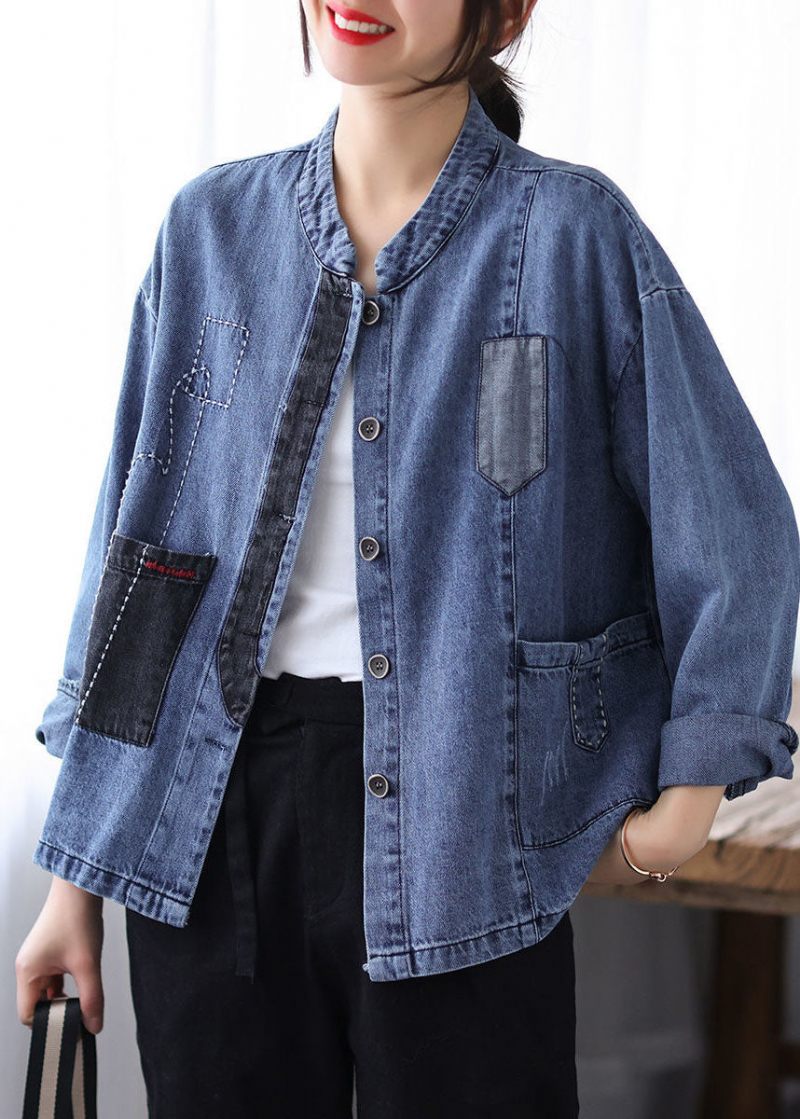 Casual Blå Stativ Krage Patchwork Knapp Jeansrockar Våren