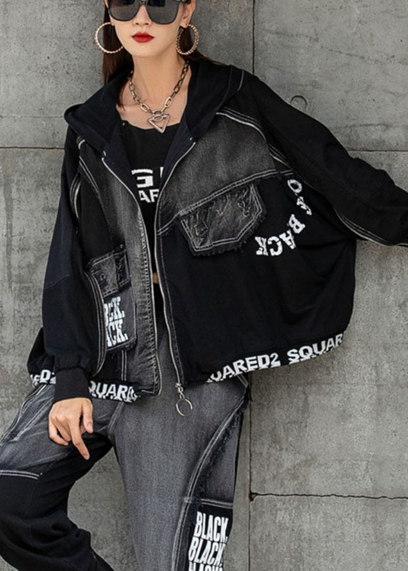 Casual Svart Blixtlås Patchwork Bat Wing Sleeve Höst Hoodies Ytterkläder