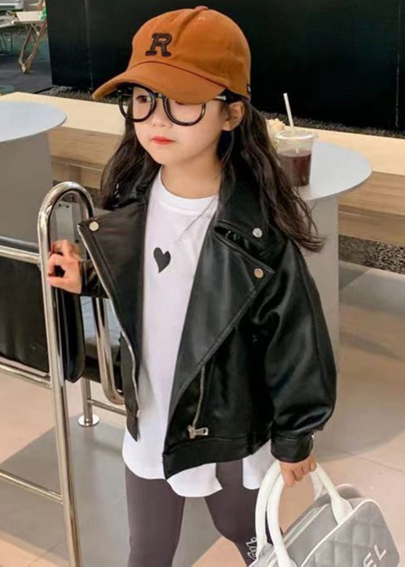 Chic Svart Peter Pan Krage Zip Up Faux Leather Girls Rocks Fall