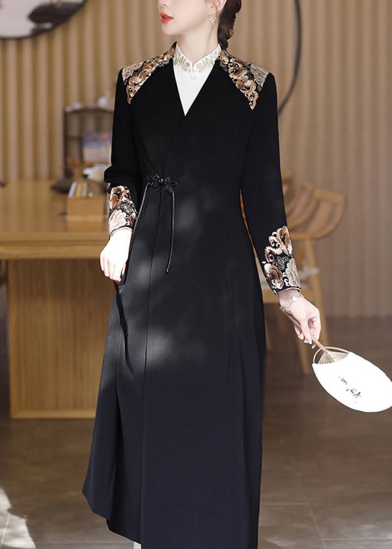 Chic Svart V-hals Broderad Knapp Satin Trench Coats Fall