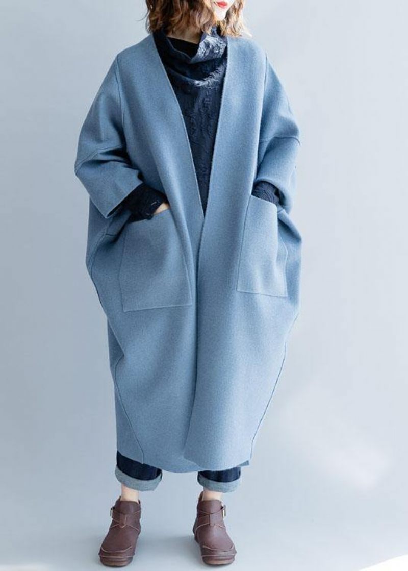 Dam Blå Ullöverrock Löst Sittande Lång Vinterkappa Höstjackor Batwing Sleeve