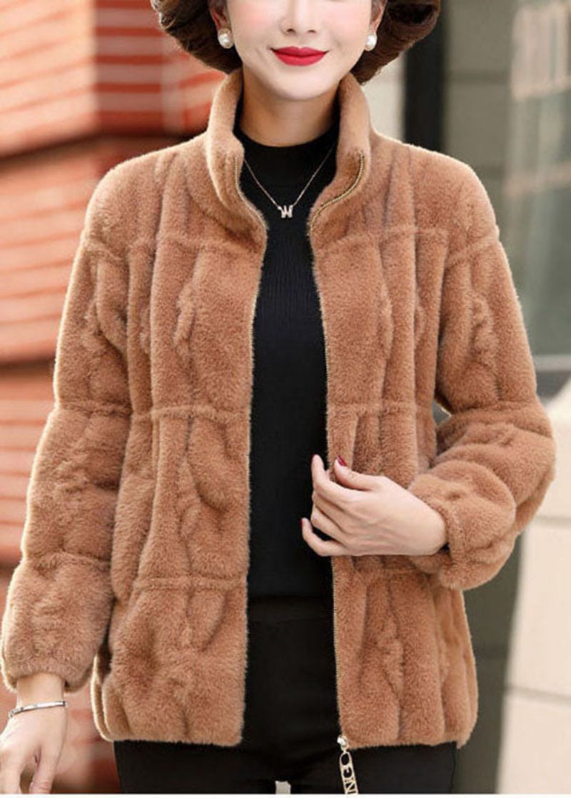 Dam Camel Enfärgad Krage Zip Up Mink Hår Stickade Kappor Vinter