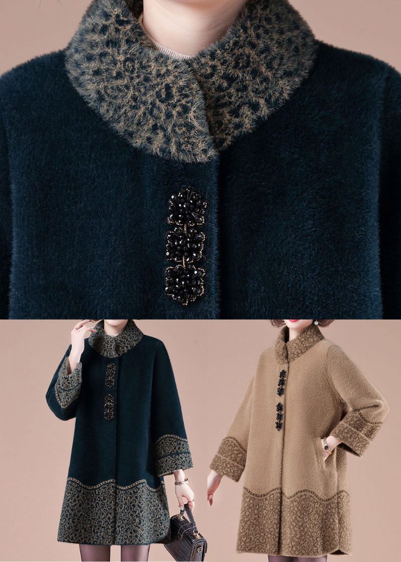 Dam Kamel Stativ Krage Fickor Print Mink Hår Stickade Jackor Vinter