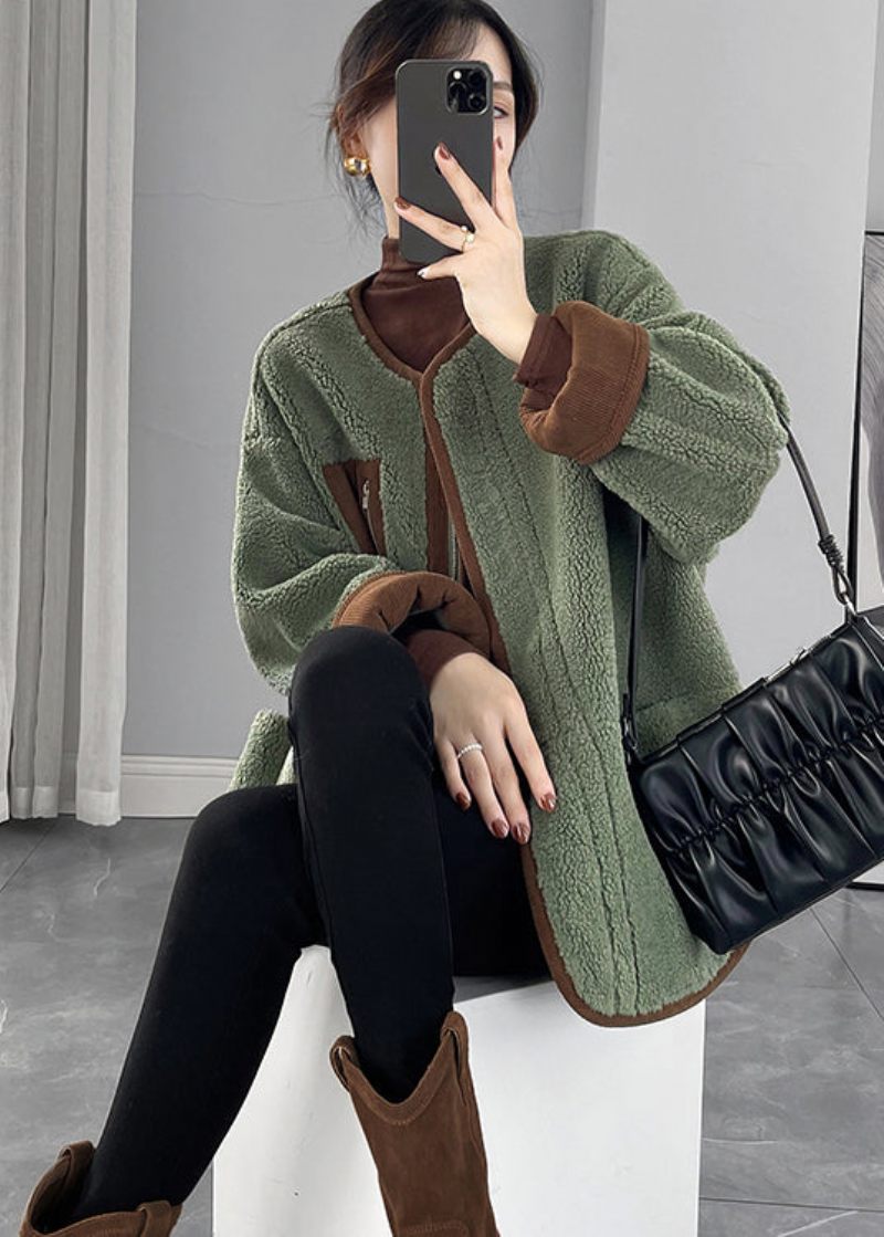 Ekologisk Grön Oversized Patchwork Fuskpäls Teddy Coat Vinter