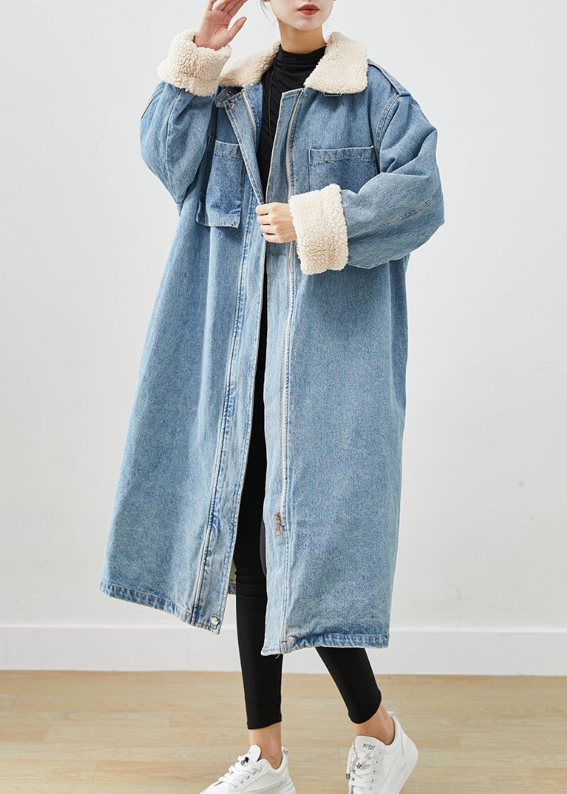 Elegant Blå Överdimensionerade Fickor Fleece Ull Fodrad Denim Trench Fall