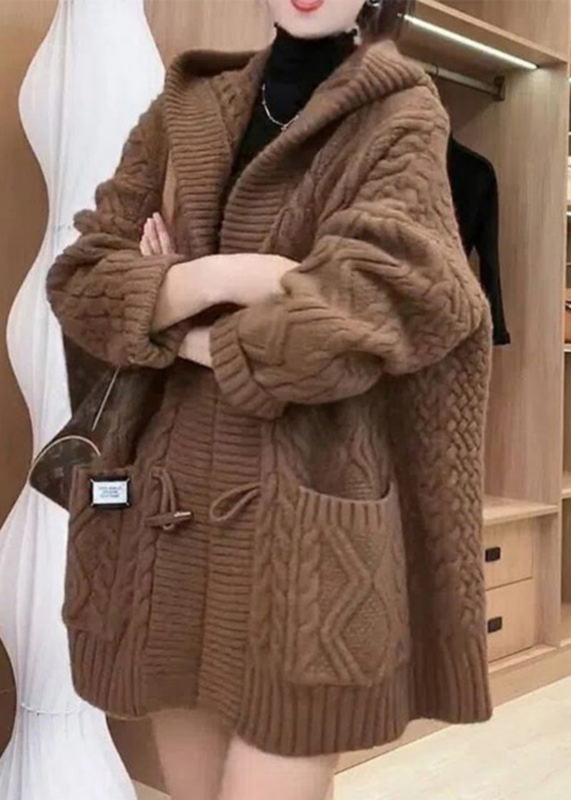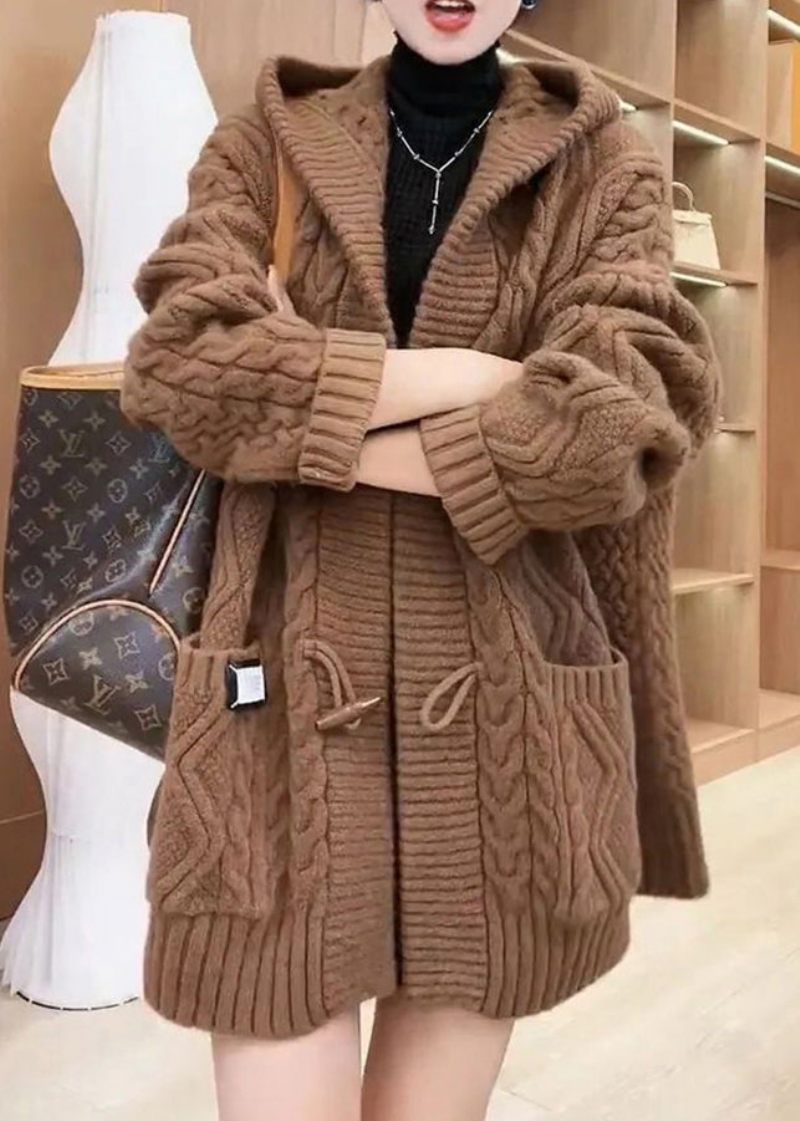 Elegant Choklad Färg Knapp Kabel Stickade Tröjor Kappor Höst