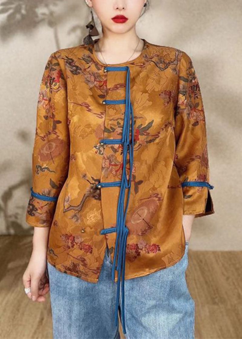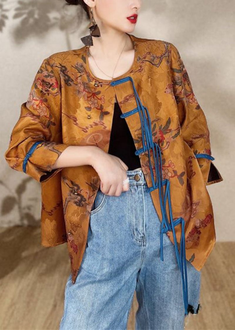 Elegant Gold Print Button Silk Coats Armbandsärm