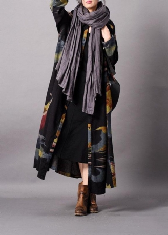 Elegant Grå Rutig Yllekappa Dam Plus Size Långa Kappor Med Skårade Fickor