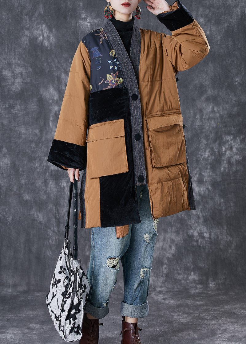 Elegant Kaffe V-hals Patchwork-fickor Fina Bomullsfyllda Jackor Vinter