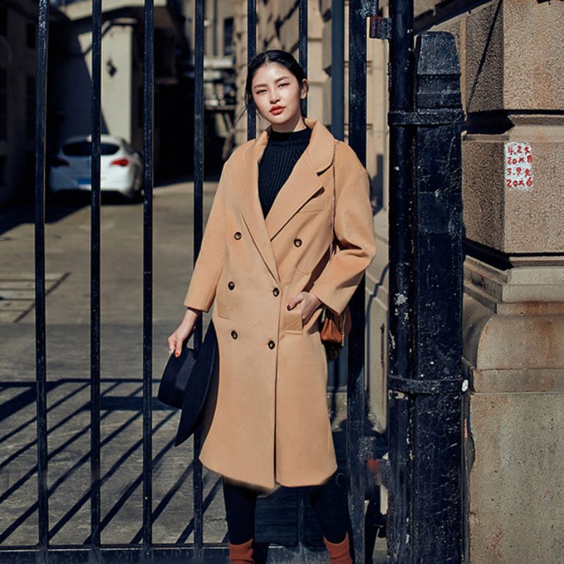Elegant Khaki Kappor Oversize Skårad Ullkappa Mode Dubbelknäppt