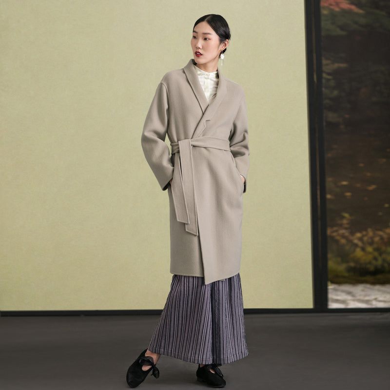 Elegant Ljusgrå Ullkappa Casual Stativ Krage Vinterkappa Knyt Midja Damrockar