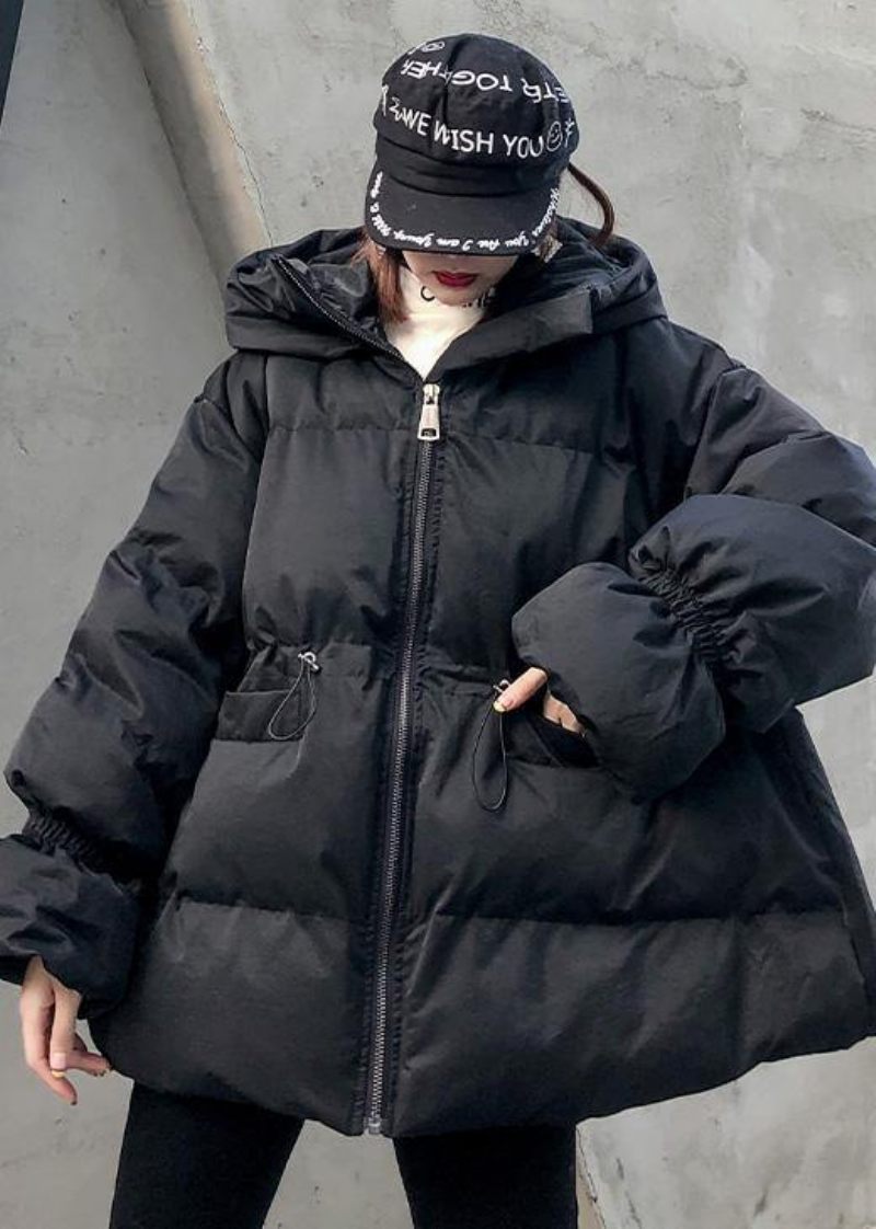 Elegant Löst Sittande Vinterjacka Med Dragsko Svart Damparkas Med Huva