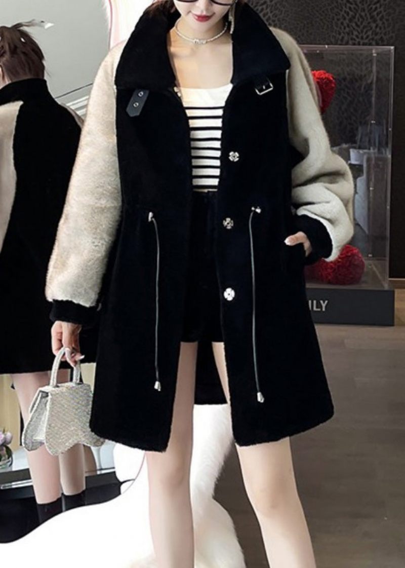 Elegant Svart Grå Peter Pan Krage Fuskpäls Patchwork Dragsko Knapp Mink Sammet Läder Och Pälsrockar Vinter