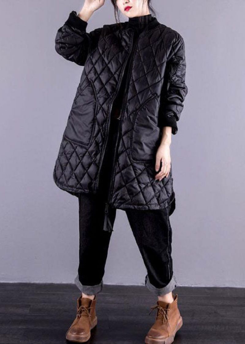 Elegant Svart Stativ Krage Zip-up Fickor Fina Bomullsfyllda Kappor Vinter
