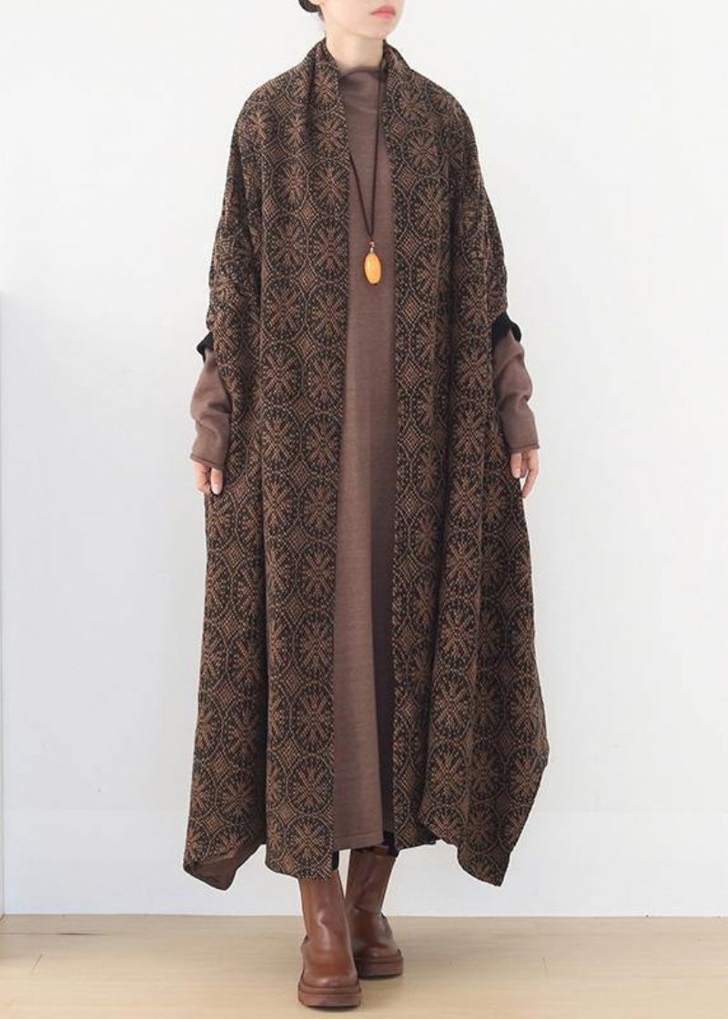 Eleganta Oversized Mellanlånga Kappor Vinterbrun Batwing Sleeve V-ringad Ylle Ytterkläder