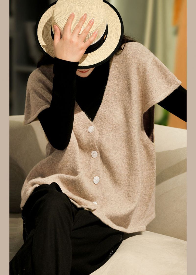 Enkel Beige V-ringad Knapp Ull Stickad Väst Kortärmad