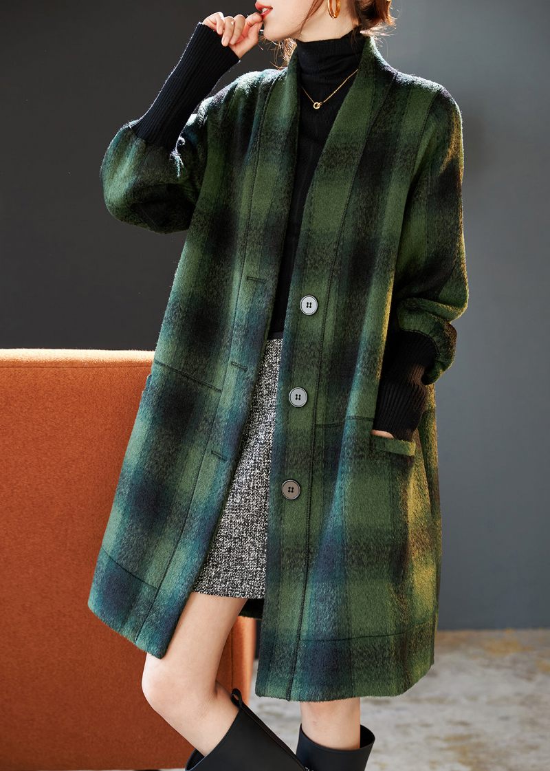 Enkel Grön V-hals Pläd Tjocka Yllerockar Vinter