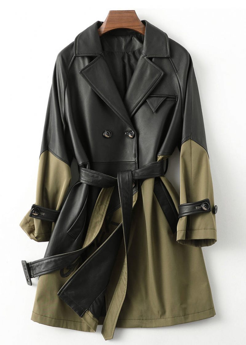 Enkel Khaki Peter Pan Krage Patchwork Knyt Midja Knappfickor Fårskinn Trenchcoats Långärmad