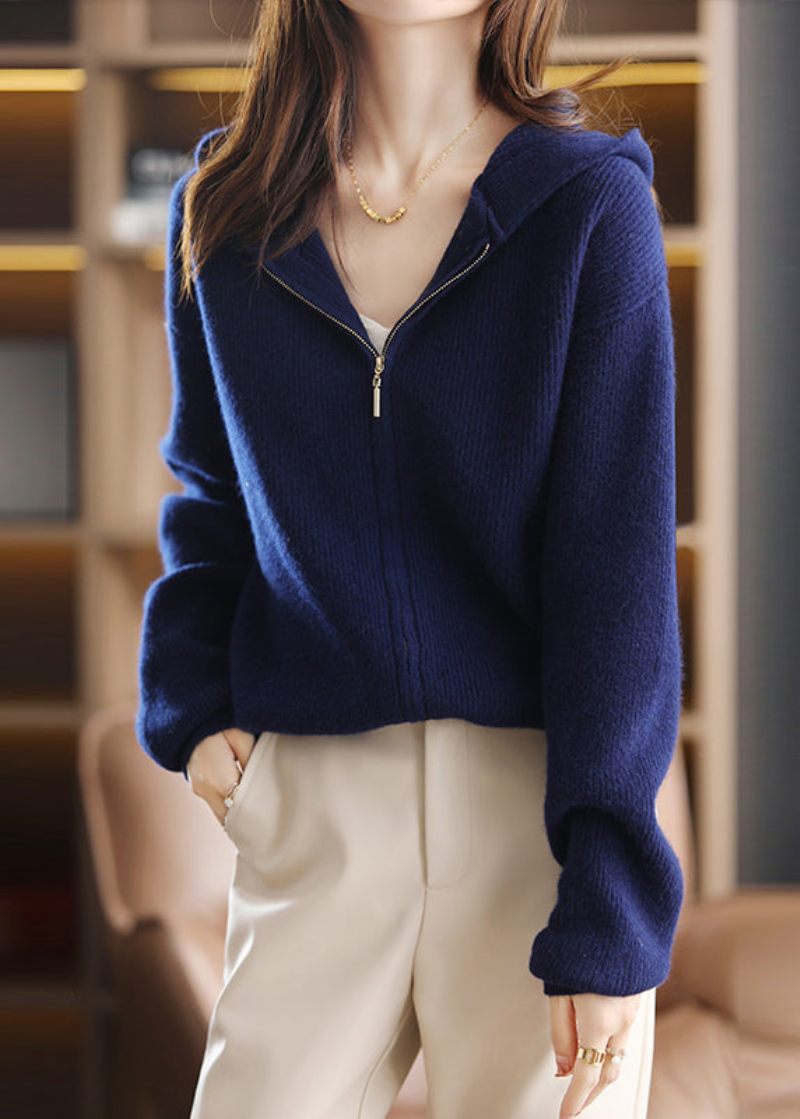 Enkel Marinblå Zip Up Patchwork Hooded Woolen Knit Coats Fall