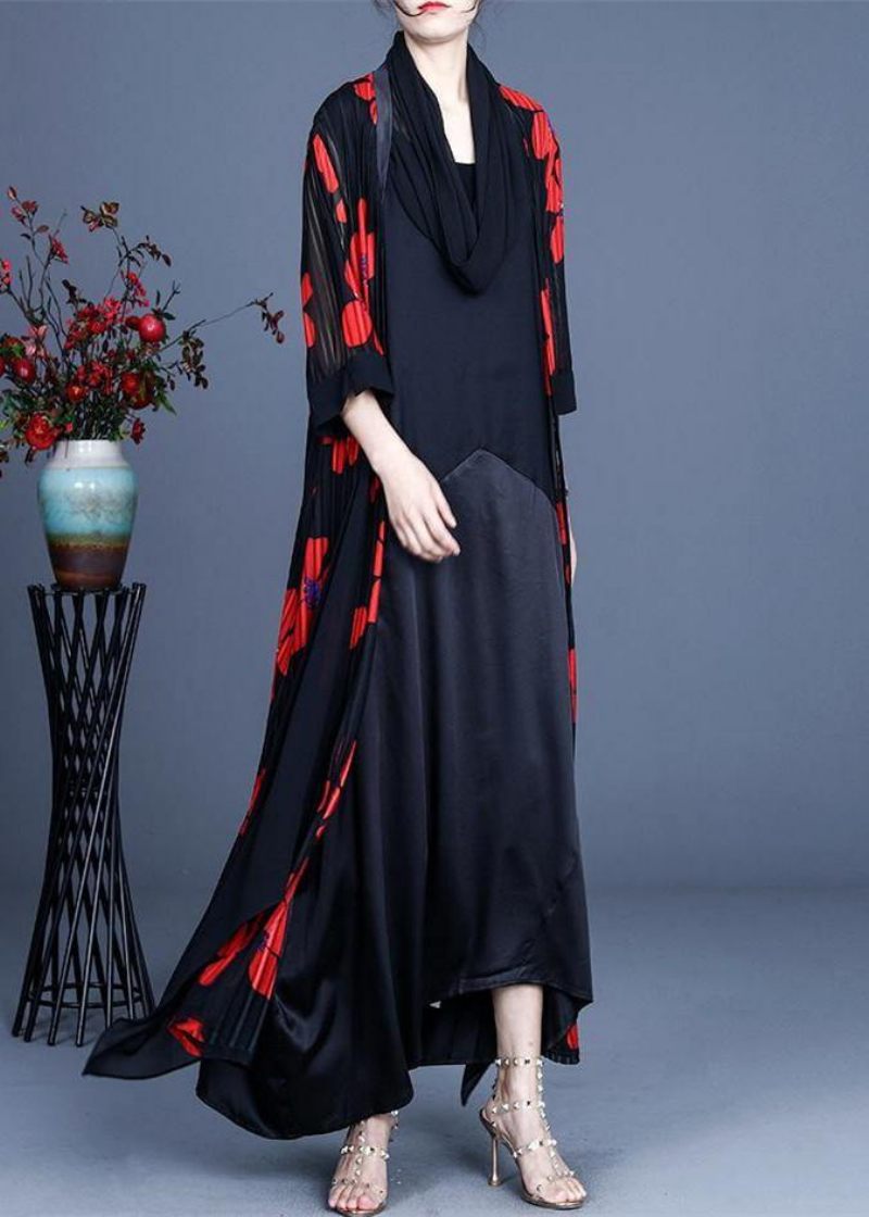 Enkel Röd Blommig Sommar Siden Lång Lös Jacka