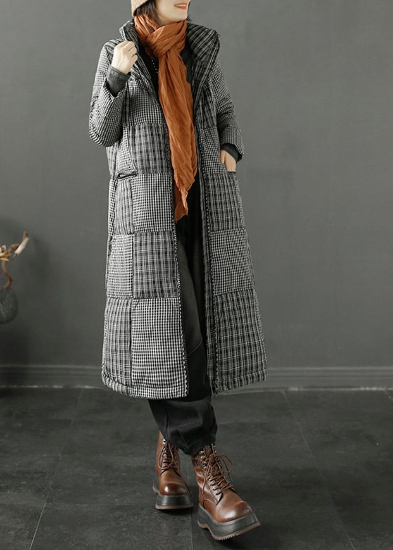 Enkel Svart Rutig Stativ Krage Patchwork Duck Down Pufferrockar Vinter