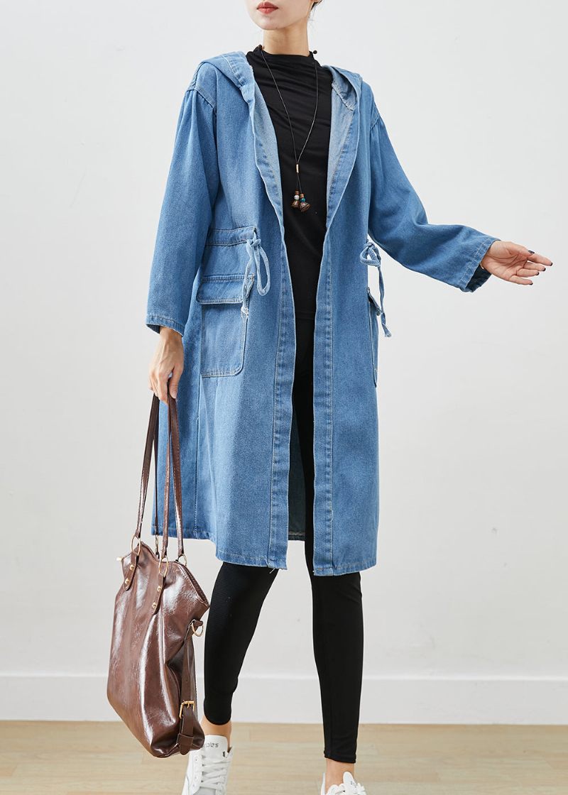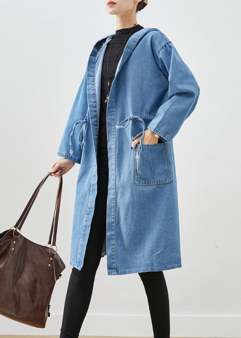 Enkla Blå Cinched Hooded Fickor Denim Trench Fall