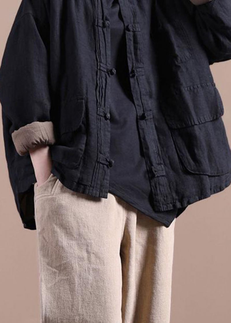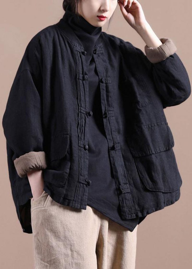 Enkla Svarta Fickor Med O-ringad Knapp Tjock Kappa Långärmad