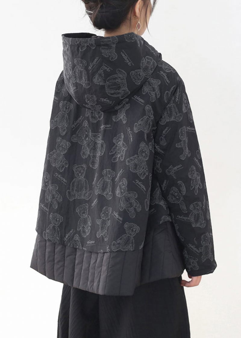 Fashion Black Button Patchwork Print Fickor Hooded Parka Long Sleeve