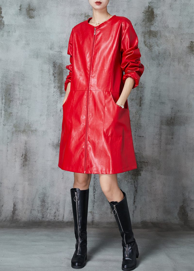 Fin Röd O-hals Patchwork Konstläder Trench Spring