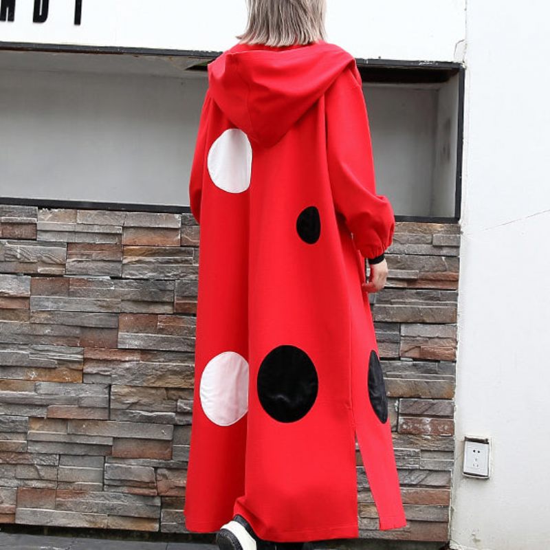 Fin Röd Prickig Kappa Oversize Huva Ytterkläder Fashion Sida Öppen Baggy Långa Kappor