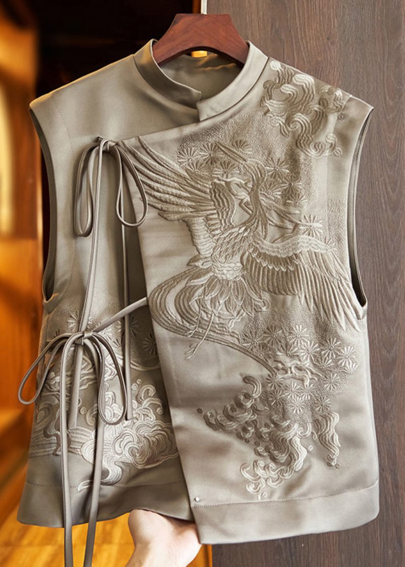 Fin Svart Broderad Snörning Patchwork Sidenväst Ärmlös