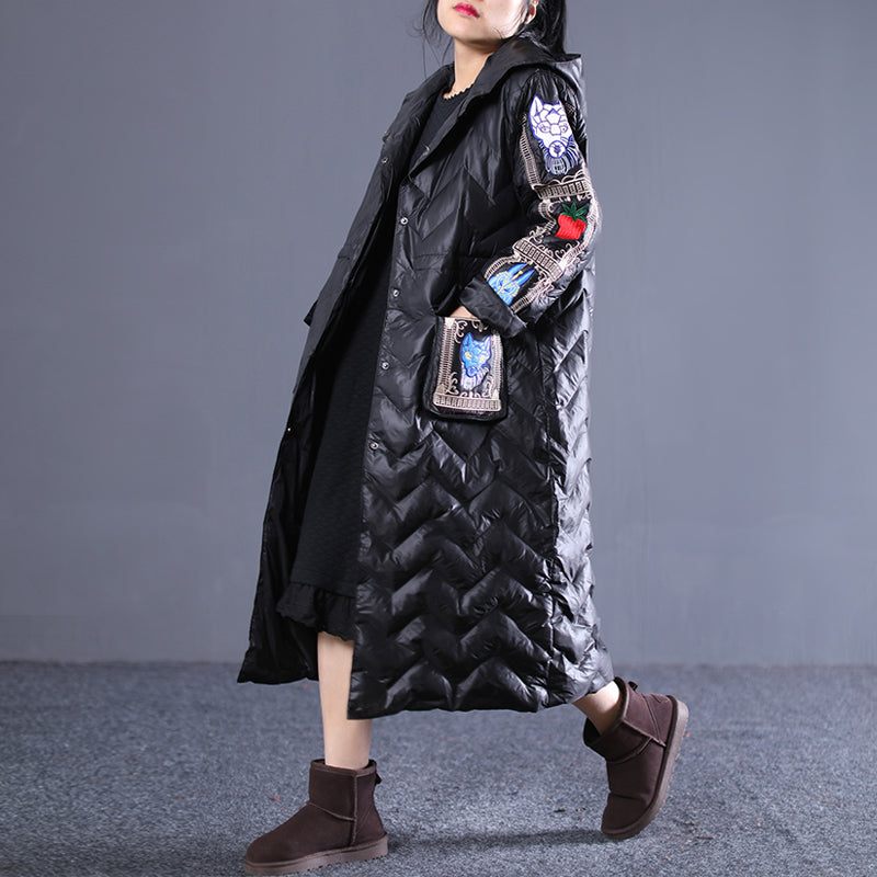 Fin Svart Vinterdunrock Löst Sittande Dunkappa Med Luva Lyxiga Broderifickor Vinterdunkappa