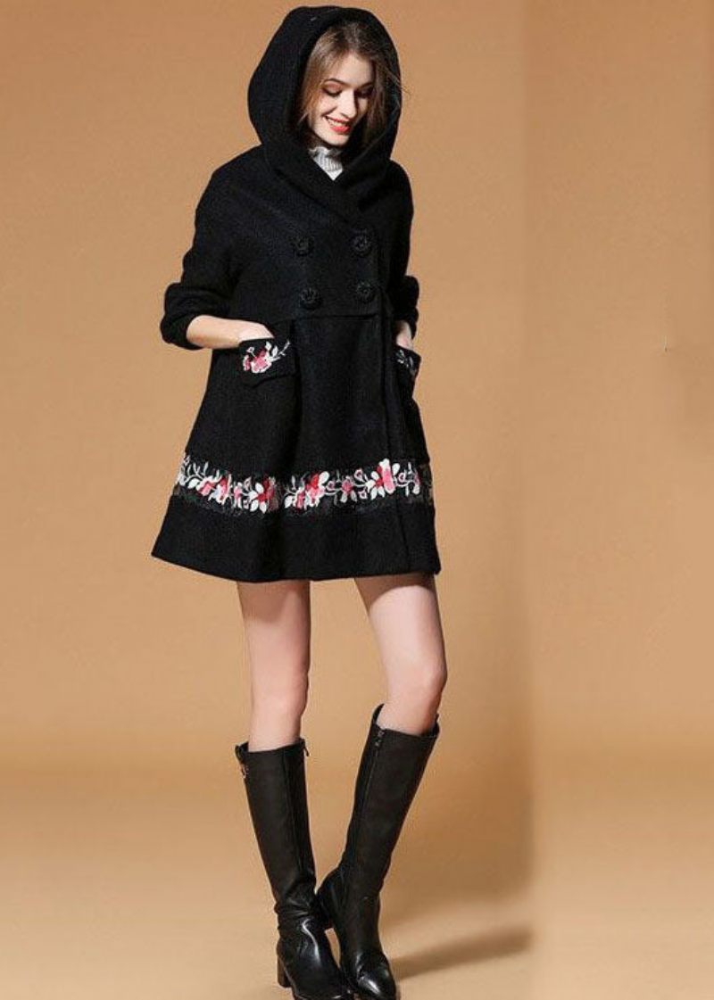 Fina Svarta Broderade Yllerockar Med Huva Halvärm