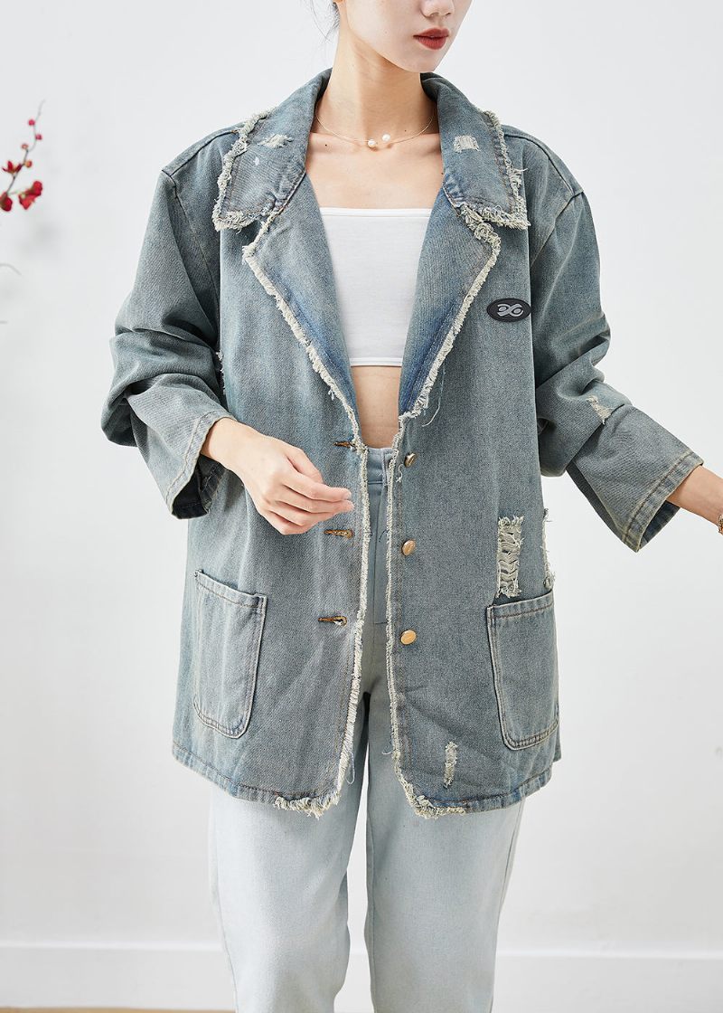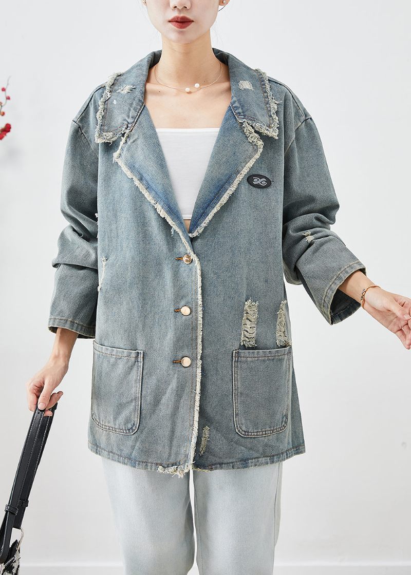 Fransk Blå Grå Oversized Fickor Denim Ripped Coat Ytterkläder Höst