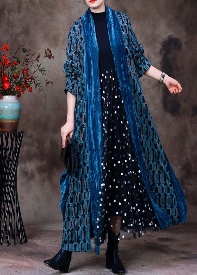 Fransk Blå Pläd Patchwork Bomull Lösa Cardigans Långärmad
