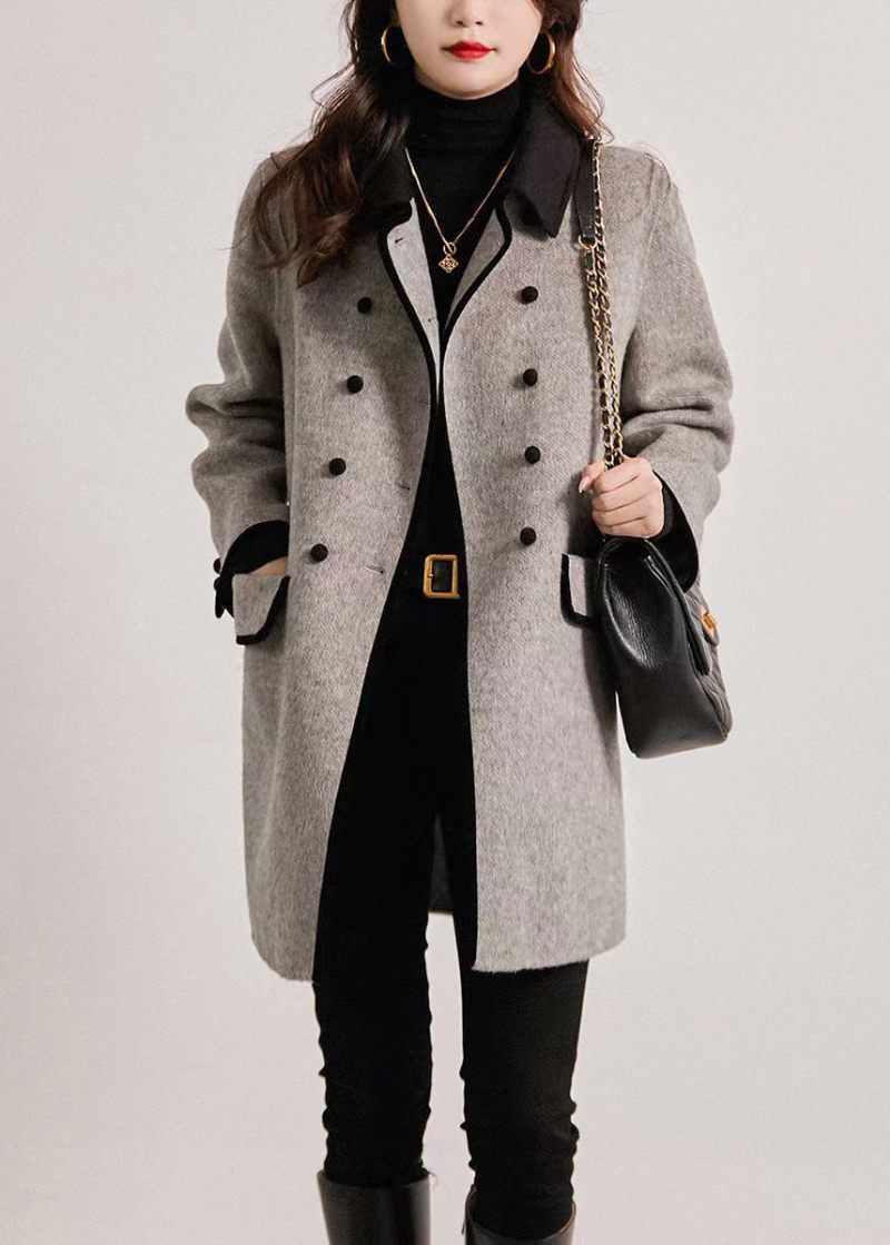 Fransk Grå Dubbla Bröstfickor Patchwork Yllerockar Höst